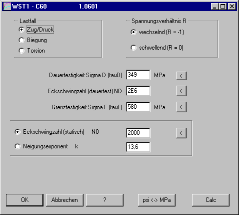 Im Eingabefenster zum Wöhler-Diagramm wurden Hilfetexte und ein Hilfebild zur Erläuterung der Eingaben ergänzt. Mit WST1 kann man 6 verschiedene Wöhlerkurven generieren: für Zug/Druck, Biegung und Torsion jeweils für wechselnde Last oder schwellende Last.