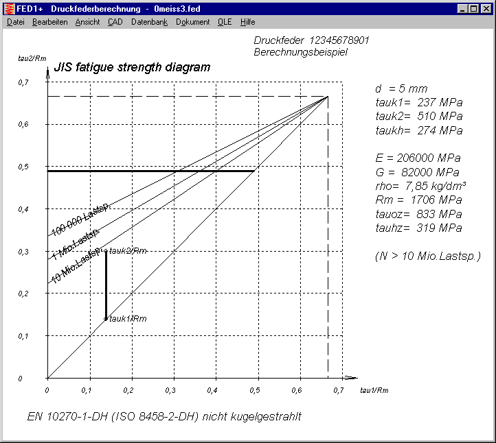 Mit der zulässigen Hubspannung bei schwellender Last (tau1=0) aus dem Goodman-Diagramm wird das JIS-Dauerfestigkeitsdiagramm konstruiert. Somit gibt es bei den Federprogrammen jetzt 5 verschiedene Dauerfestigkeitsschaubilder zur Auswahl: Goodman, Haigh-Goodman, Smith, SN (Wöhler) und JIS.