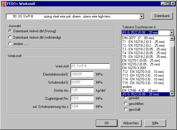 Für die Toleranz des Drahtdurchmessers d kann man jetzt auch die japanische JIS G 3522 wählen.