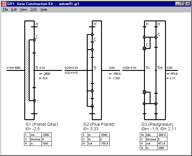Four connector shafts Si, C, H, Se can be defined as driving (in), driven (out), control or idle. By means of the buttons 1,2,3,4,R you can shift the standard gears of the Ravigneaux gear.