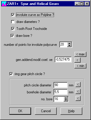 Same as known from WN2, at "CAD->Gear Wheel" and "STL->Gear Wheel" you first get a dialogue window with settings. New for ring gears is the possibility to define a pitch circle with bore holes. This is useful if you produce ring gears directly with 3D printer.