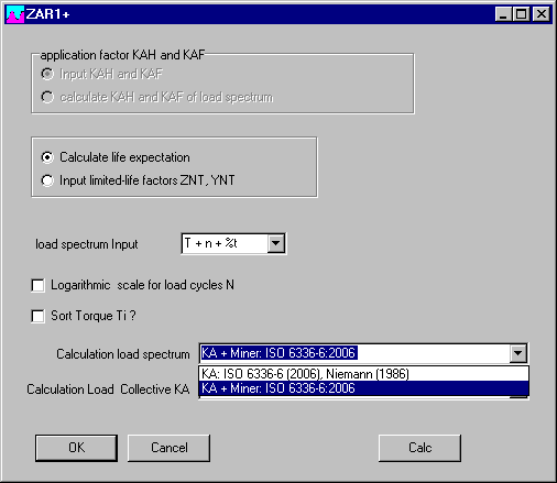 Until now, our ZAR-Software used calculation method according to Niemann to calculate application factors KA from load spectrum. This method is described in ISO 6336-6 annex A with purpose of a first estimation only. So we have added the preferred method to Palmgren-Miner as described in ISO 6336-6. Select both methods at Edit\Load spectrum\Config.