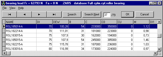 For full compl. needle bearings, clearance between rollers is calculated by the program (pitch diameter clearance TES = 5E-3 Z according to Schaeffler). Then roller race diameter of shaft and bore can be calculated. To select full compl.needle bearings as known from other roller bearing databases, a new database file was created for pin diameters of 1mm until 6mm and pin length of 5.8mm until 39.8mm and 10 until 50 pins, with calculated race diameters, rated load C and C0 and mass. This results in a new database file with 2500 records.