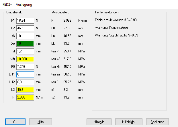 In FED2+ gibt es noch verschiedene Methoden zur schnellen Auslegung und Nachrechnung von Zugfedern. Unter "Bearbeiten\Auslegung" und "Bearbeiten\Nachrechnung" wird jetzt eine geeignete Ösenhöhe (abhängig von der gewählten Öse) vorgeschlagen, wenn man LH=0 eingibt.