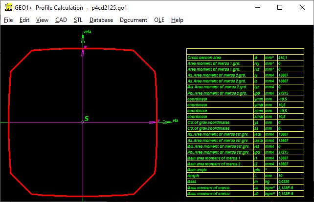 A polygon trochoid with 2 corners results in an ellipse, with 3 corners in P3G. With 4 corners there is a P4C contour, but without limitation by circular arcs. A correct P4C contour can also be loaded into GEO1+: save it in WN7 under "File \ Export DXF" or "CAD \ P4C", then load it into GEO1+ under "File \ Import DXF". In GEO1+ area and area moments are calculated from the sum of the coordinates. A comparison of a P3G profile generated in GEO1+ with data calculated from WN6 shows a good match for cross-sectional area A and moments of area Ip and Ix. The center of gravity is exactly in the zero point. The moment of resistance Wmin is I / rmax with rmax = d2 / 2. With Wx = Ix / d2 / 2 there is good agreement, with Wp = Ip / d2 / 2 there is a deviation of approx. 10% with Wp from DIN 32711.