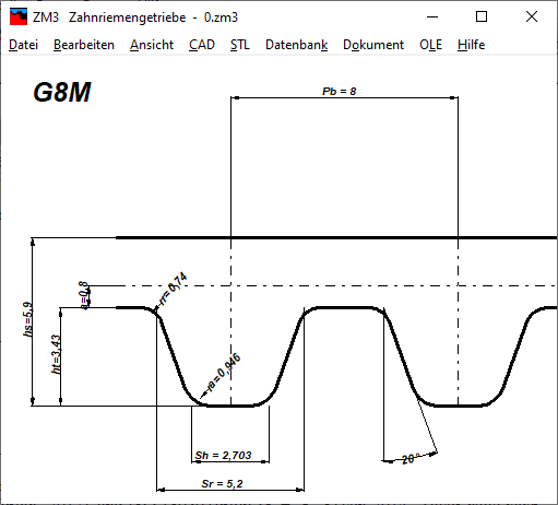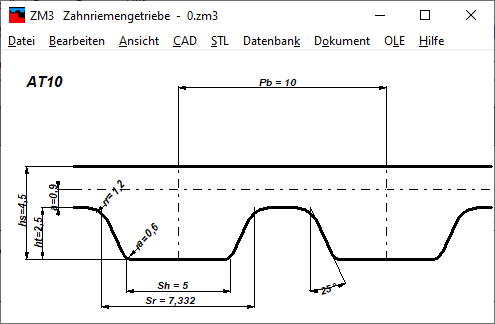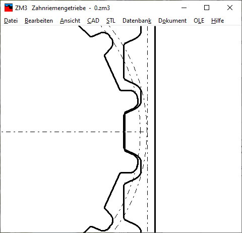 ZM3 generiert auch ein Bild vom Zahneingriff Zahnriemen mit Riemenscheibe. Beim T-Profil fällt auf, dass das Flankenspiel sehr groß ist. Für Antriebe mit Drehrichtungsumkehr ist das T-Profil so nicht zu gebrauchen, außer man verändert das Zahnprofil der Riemenscheiben.