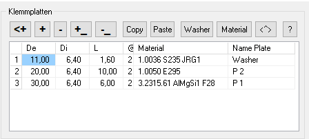 Mit dem Button "<+" werden für die nächste Klemmplatte die Daten der Vorgängerplatte übernommen. Nur den Werkstoff musste man nochmal von Datenbank wählen, um die Werkstoffdaten zu übernehmen. Künftig werden auch die Werkstoffdaten mit übernommen.