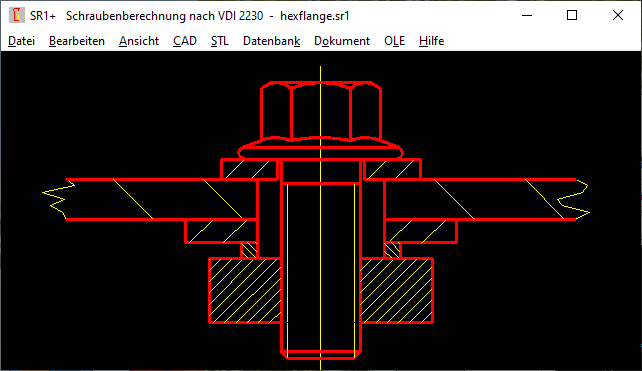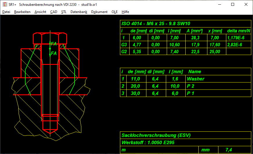 Des öfteren wird gefragt, wie man einen eingeschraubten Gewindebolzen mit Mutter berechnen kann. Wenn das zuerst eingeschraubte Gewinde nicht berechnet werden muss, ist das einfach: Der eingeschraubte Bolzen wird als Schraube definiert mit einem großen Sonderkopf.