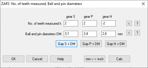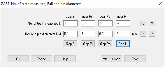 At "Edit Measurement" , a push of the new buttons "Gap" shows a drawing of the tooth gap with measuring circle in the background window for sun gear S, planet gear P, ring gear H.