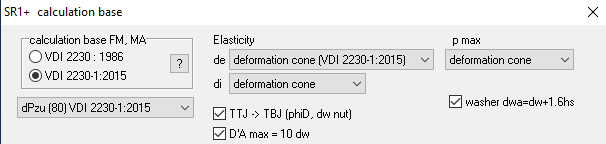 Under "Calculation method" you can now configure "di deformation cone" to calculate the hole in the clamping plates as a cone instead of a cylinder in the case of elastic resilience. If you use clamping plates with standard-compliant bores, this is of no interest, the result always remains the same. The elastic resilience deltaP only changes if several clamping plates with changing inside diameters or elongated holes are used. Instead of the inner diameter of the clamping plate, a cone from the inner contact diameters of the adjacent clamping plates is then used.