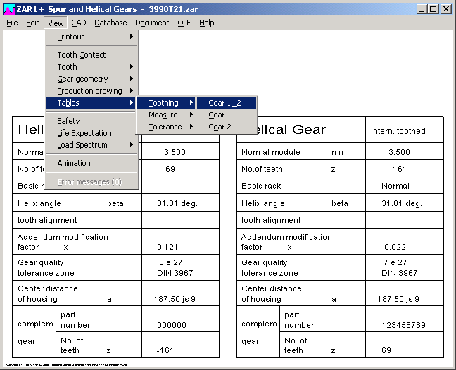 At "View->Tables", charts with gear data, measurement data and tolerances have been added.