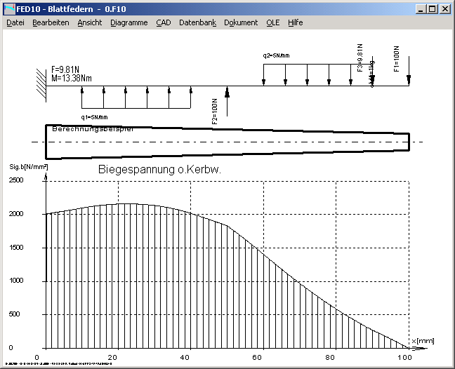 FED10 berechnet Spannungen, Durchbiegung und Resonanzfrequenz von ebenen, symmetrischen sowie unsymmetrischen Blattfedern.