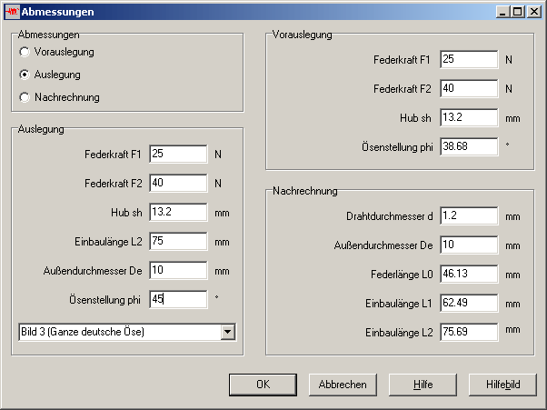 In der Auslegung wird aus Federkräften, Hub, Windungsdurchmesser und Einbaulänge eine passende Zugfeder berechnet. In der Nachrechnung lassen sich bei Vorgabe der Abmessungen vorhandene Federn überprüfen. Berechnet werden alle benötigten Federkräfte, Federwege, Federrate, Federarbeit, Spannungen, Drahtlänge, Eigenfrequenz, Gewicht. Den größt- und kleinstmöglichen Drahtdurchmesser kann man sich