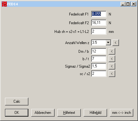 In der Vorauslegung muß man nur 2 Federkräfte und einen Hub, oder eine Federkraft und einen Federweg eingeben, und FED14 berechnet die Abmessungen. Hierbei kann man die Parameter Wellenzahl, Wickelverhältnis, Sicherheit Sigmaz/Sigma2 (Spannung) und sc/s2 (Blockfederweg) nach Bedarf verändern.