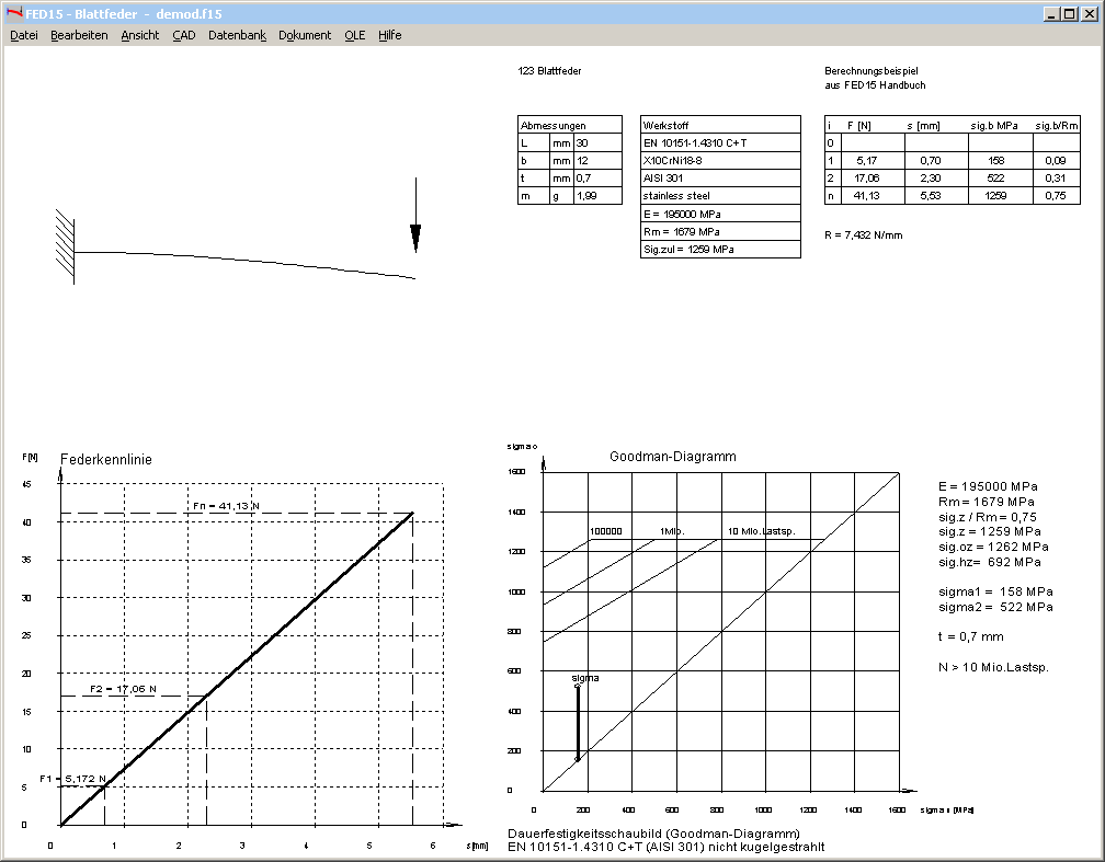 Ein Berechnungsprogramm für Blattfedern gibt es zwar schon. Mit FED10 kann man Durchbiegung und Spannung an jeder Stelle der Blattfeder berechnen, und die Feder mit mehreren Radial- und Axialkräften, Biegemomenten und Streckenlasten beaufschlagen.