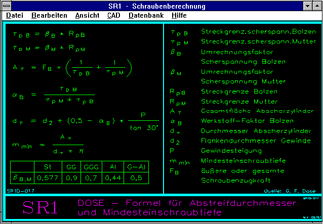 Für Sacklochgewinde wird die erforderliche Mindesteinschraubtiefe nach der Dose-Formel berechnet. Bei Unterschreitung wird eine Fehlermeldung angezeigt. Die Ausgabe wurde um die Sicherheit gegen Abstreifen des Gewindes bei der Kraft (FM+FSA) erweitert. Außerdem wird die Sicherheit gegen Abstreifen des Gewindes bei Rp berechnet. Diese muß nur dann größer