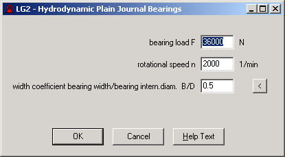 Enter only radial load and shaft speed, LG2 calculates dimensions of bearing and shaft, bearing clearance and tolerances. The program selects forced lubrication, if required, and chooses lubricant according to requirements of film thickness and friction.