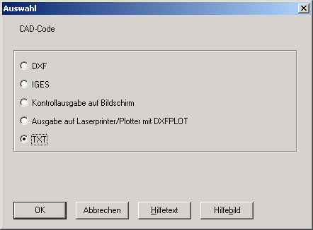 Wenn man anstelle der Ergebnisliste eine Zeichnung oder ein Diagramm in DXF- oder IGES-Format erzeugen möchte, wird folgender Parameter verwendet: